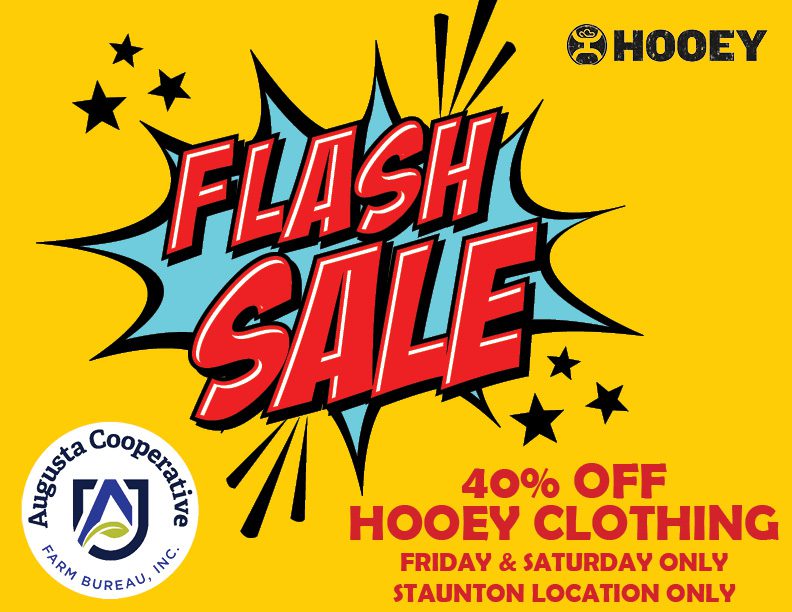40% off Hooey clothing. Friday, November 24 – Saturday, November 25 only. Staunton location only. In stock items only.