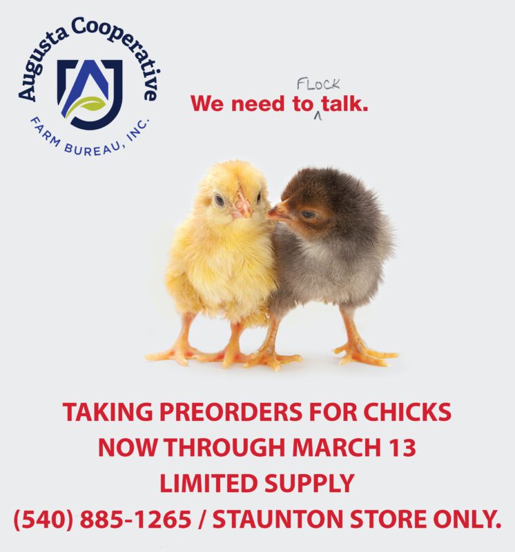 Call the Staunton store at 540-885-1265 to preorder chicks now through March 13! Limited supply.