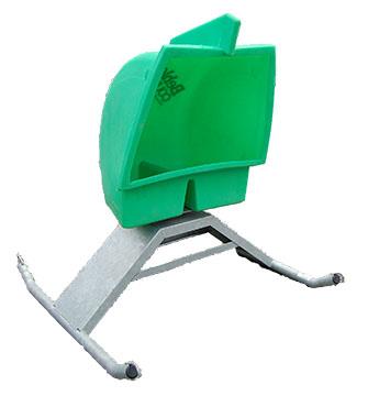 An updated design on a durable mineral feeder. This design features galvanized legs in a rocker skid design. This provides a better balance than the traditional 4 leg design and is as sturdy as the trapezoidal base design. This sturdiness is achieved with less metal contacting the ground for longer life. Can hold two blocks or up to 140 lbs of loose mineral and has a durable all light green poly construction hood with built-in windvane for long life. Hood helps to protect the mineral from weather and rotates away from the prevailing wind and has high quality bearing and grease fitting to allow easily and long life. Built in tow hooks on all four corners for easy movement of the feeder.