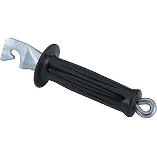 A heavier duty gate handle for electric fences. Safety hook and body formed as one. Spring mechanism consists of 4-1/4″ long compression spring fastened to a 5/16″ diameter eyebolt. Large insulating grip measures 5-1/8″ long with a 2-1/4″ diameter flange for extra shock protection. Molded of soft flexible material on the outside of the handle for a solid grip.