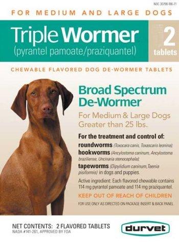 For dogs and puppies weighing 6 to 25 lbs: 6.0 to 12.0 lbs, give 1 Puppy/Small Dog(30mg) tablet 12.1 to 25.0 lbs, give 2 Puppy/Small Dog(30mg) tablets For dogs weighing more than 25 lbs: 25.1 to 50.0lbs, give 1 Medium/Large Dog(114mg) tablet 50.1 to 100.0 lbs, give 2 Medium/Large Dog(114mg) tablets 100.1 to 150.0 lbs, give 3 Medium/Large Dog(114mg) tablets 150.1 to 200.0 lbs, give 4 Medium/Large Dog(114mg) tablets Offer the proper dosage by hand or in the dog’s food container, with or without food. Do not withhold food from your dog prior to or after treatment. Consult your veterinarian for assistance in the diagnosis, treatment and control of parasitism. PRECAUTION: The safety of Durvet Triple Wormer in breeding dogs and pregnant bitches has not been determined. Not for use in puppies under 12 weeks of age.