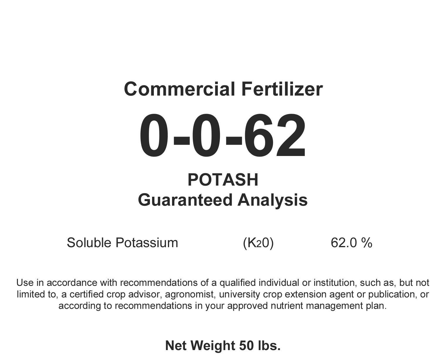 potash. Contains 0% nitrogen, 0% phosphorus, and 60%
