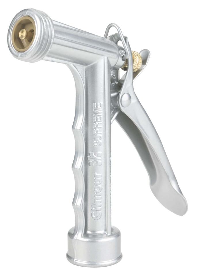 Full size metal pistol grip nozzle that features a threaded front. This allows you to attach an accessory to the front of the nozzle. Solid metal body. Solid brass valve stem with permanent adjusting nut. Hold-open clip for continuous spraying. Rust-resistant stainless steel spring. Self-adjusting duck packing for lifetime leakproof seal.