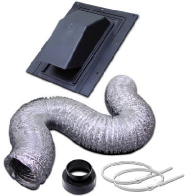 black plastic roof cap, a 4″ X 8′ lama flex, and plastic adaptor and two clamps.