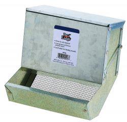 Rabbits and other small animals will not eat the fines (powdery residue) that collect in pelleted or grain feeds. If left in the feeder, these can attract harmful molds. This rabbit and small animal feeder has a wire mesh bottom that sifts fines out so they fall into the litter below. Includes independent wire hooks so the feeder can be attached to the inside of the hutch, or for more convenient filling to the outside with some wire cutting. Gravity design allows feeder to dispense several days worth of feed a little at a time. Features hinged metal lid for covering the feed. Made of chew-proof, rust-resistant, heavy-gauge galvanized steel. Measures 5.5 inch long by 5.125 inch wide by 7.125 inch high.