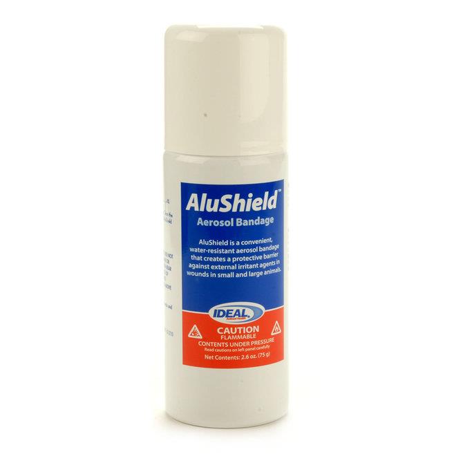 A convenient, water resistant aerosol bandage that creates a protective barrier against external irritant agents in wounds in small and large animals. Contains aluminum powder (40 mg).