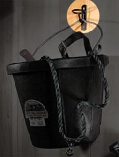 Curved hook bracket mounts to wall. Handles of buckets are slipped over the hook to secure buckets to wall.