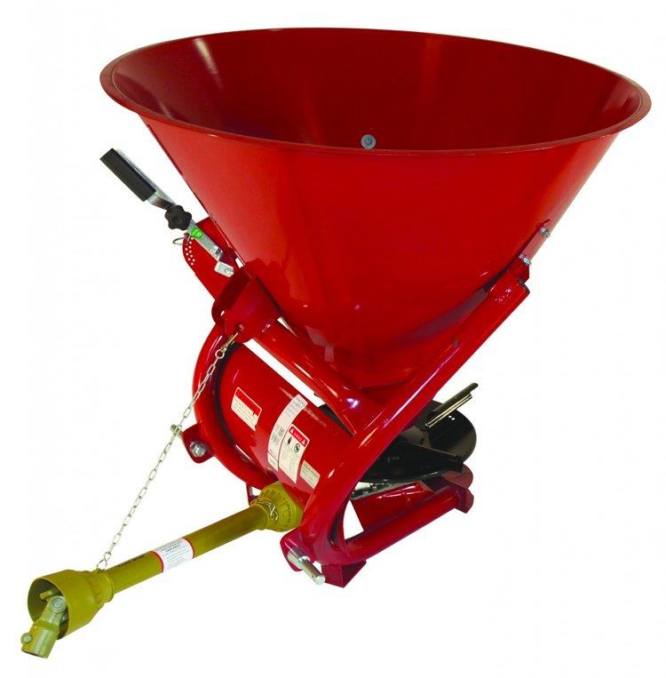 Features seamless, 1-piece, 850-lb capacity hopper. Reversible lift arm pins accommodate different tractor sizes (FS). PTO-driven spin broadcast with super treated spreading disc and galvanized fins. Can broadcast to each side individually for directional spreading when needed. Side discharge hopper guarantees greater accuracy and more even spreading. Up to 46′ spreading width. Features fully splined gearbox shaft and fully galvanized opening system kit. Super-duty epoxy painting throughout the entire frame. Category 1 quick-hitch compatible (Cat. 1 pins included).