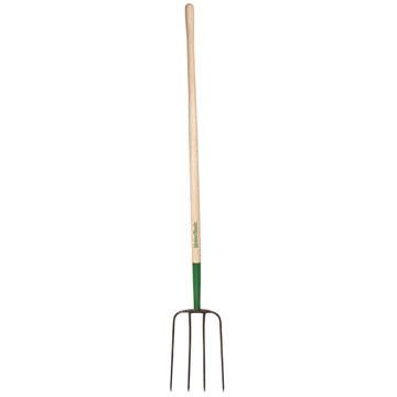 Forged manure fork w/ 4 oval tines. 12-1/2″ long tines. 8-1/4″ spread at points. 10″ ferrule. 48″ ash handle.